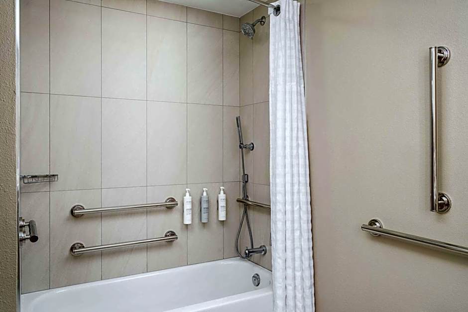 This accessible suite features a microwave, small refrigerator, and visual telephone and door alarms. A sofa bed is also included.